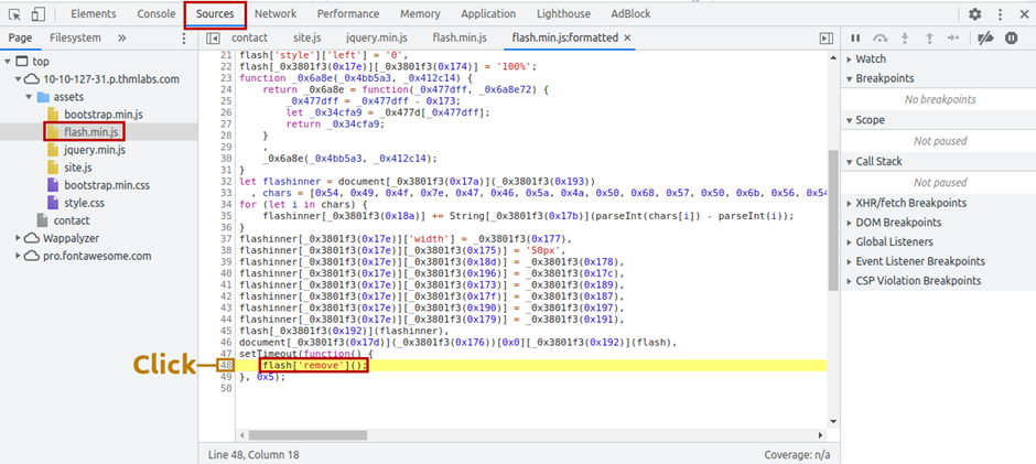 We can return some of the formattings by using the "Pretty Print" option, which looks like two braces { } to make it a little more readable, although due to the obfustication, it's still difficult to comprehend what is going on with the file. If you scroll to the bottom of the flash.min.js file, you'll see the line: flash['remove']();