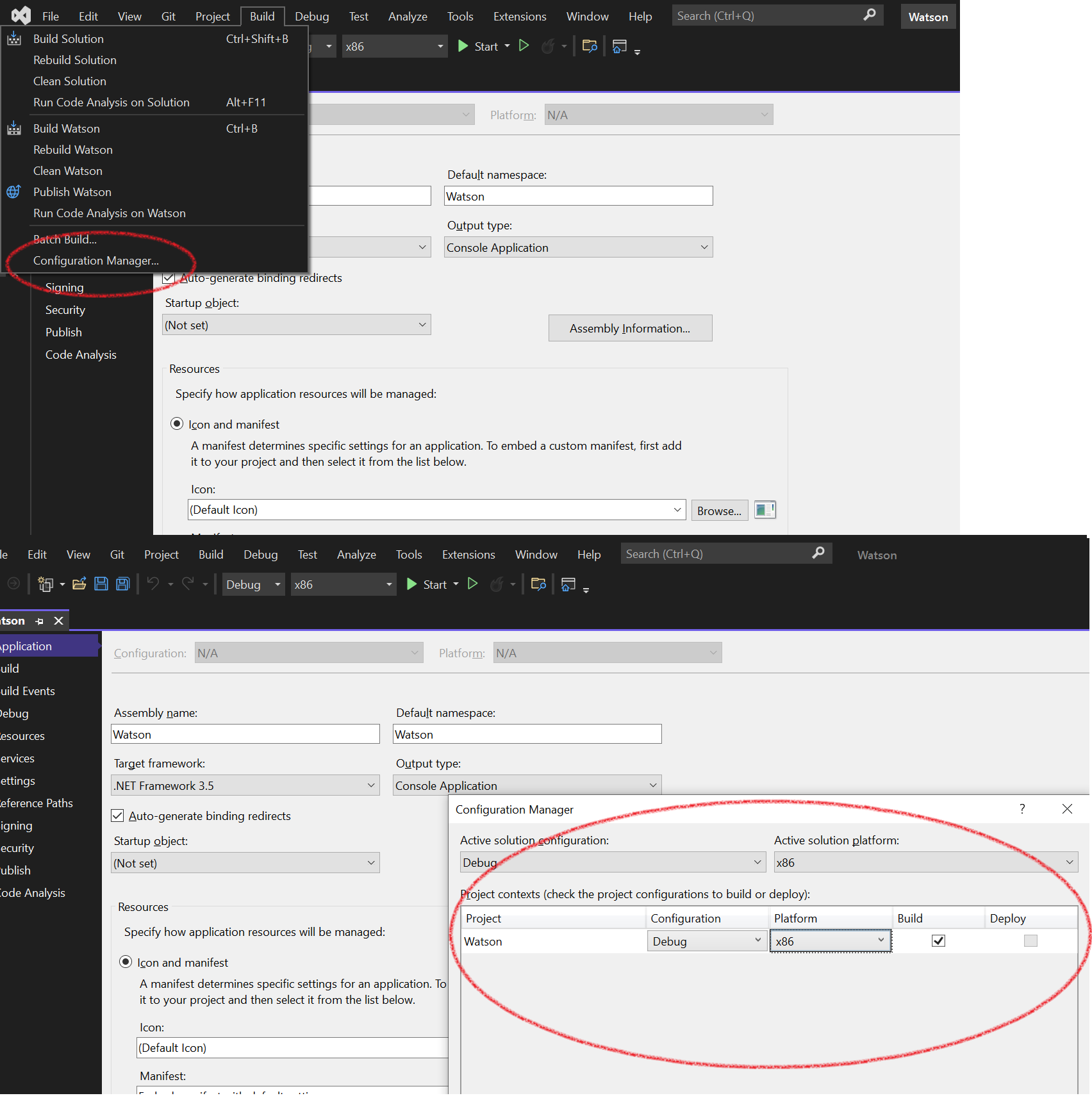Then, go to Build --> Configuration Manager and change the platform to x86.
