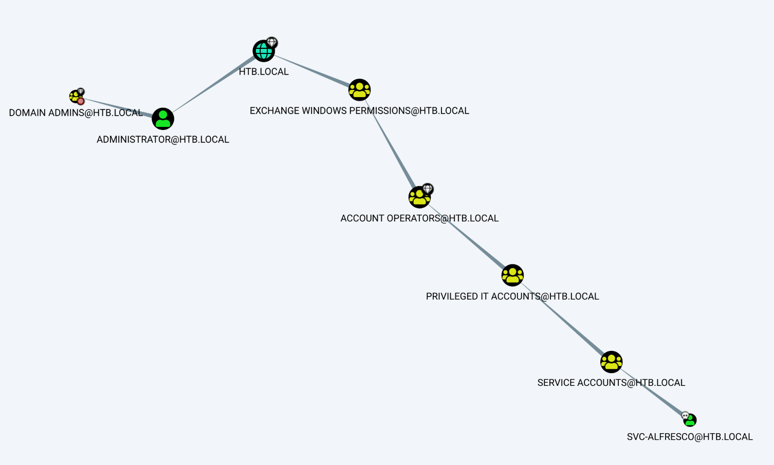 - Since SMB null session was enabled I got a lot of information from SMB, such as gouprs, password policy and users.* Since kerberos pre-authentication was disabled for the user svc-alfresco I was able to send a request to KDC (Kerberose Key Distrubtion Center) that responded with a TGT encrypted with the users password.* Since the svc-alfresco was a member of many groups that had powerful privileges, such as Account Operator and Exchange Windows Permissions I was able to create a user, and grant that user rights that made it possbile to dump all the hashes of ther users. * And since I now have the hash of the administrator I could use pass the hash technique.