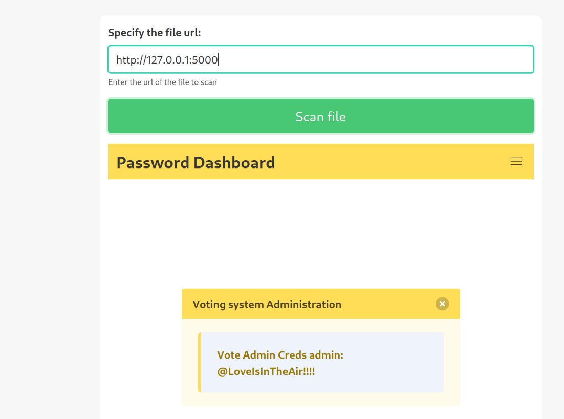 SSRF is when a malicious user cause the webserver to make an additional or edited HTTP request to the resource of the attacker’s choosing. Since we have a couple ports open we could try to make a request to the webserver. After some enumeration I found that making a request to http://127.0.0.1:5000 gives us credentials to voting systems admin panel we found earlier.