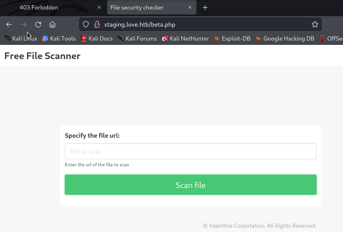 There is a "Free File Scanner" running on staging.love.htb/beta.php. This is probably vulnerable to SSRF and we could list resources we otherwise wouldnt be allowed to view.