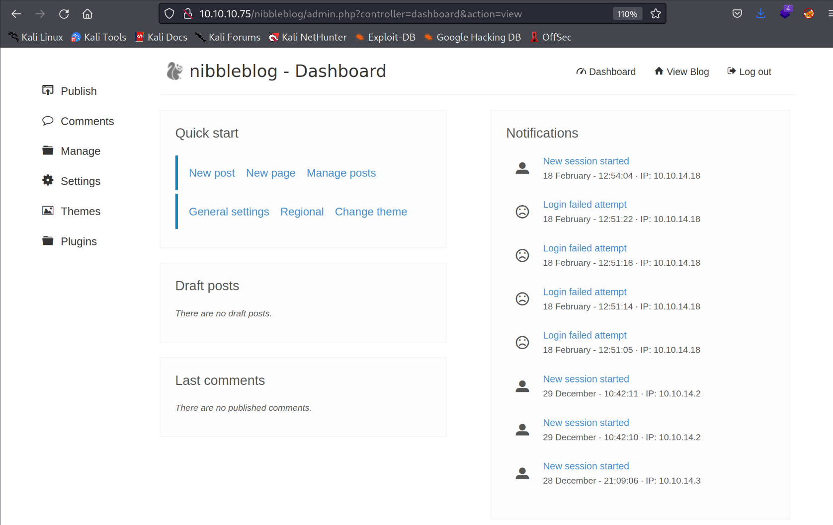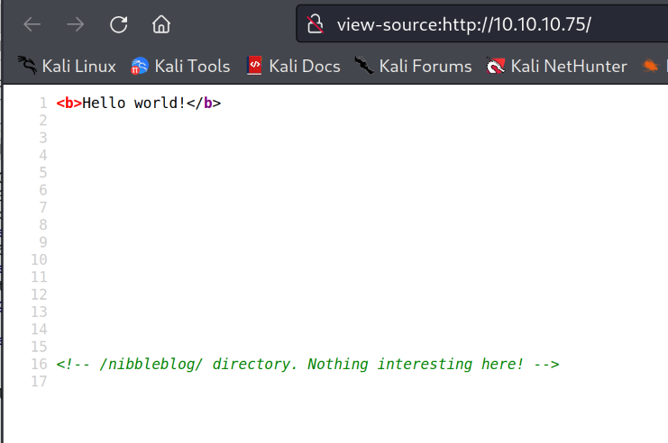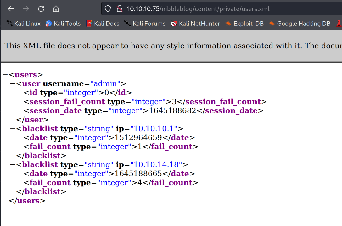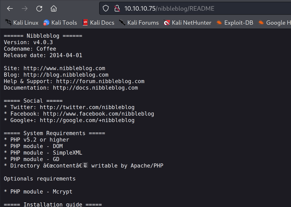 /.htaccess (Status: 403) [Size: 306] /.hta (Status: 403) [Size: 301] /.htpasswd (Status: 403) [Size: 306] /admin (Status: 301) [Size: 321] [--> http://10.10.10.75/nibbleblog/admin/] /admin.php (Status: 200) [Size: 1401] /content (Status: 301) [Size: 323] [--> http://10.10.10.75/nibbleblog/content/] /index.php (Status: 200) [Size: 2987] /languages (Status: 301) [Size: 325] [--> http://10.10.10.75/nibbleblog/languages/] /plugins (Status: 301) [Size: 323] [--> http://10.10.10.75/nibbleblog/plugins/] /README (Status: 200) [Size: 4628] /themes (Status: 301) [Size: 322] [--> http://10.10.10.75/nibbleblog/themes/]