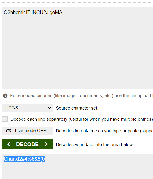 From the text above we can see that it is ecoded atleast 13 times. So decoding it 13 times we end up with Charix!2#4%6&8(0.