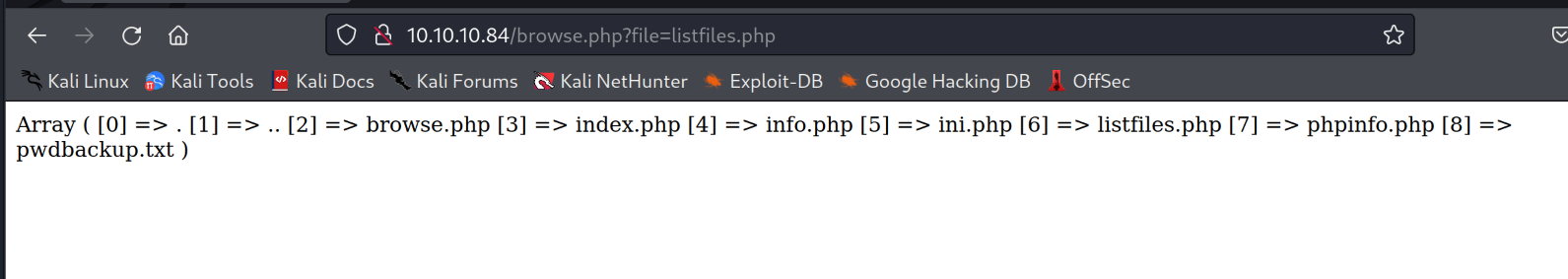 One of the files was interesting. This shows an array with files. Looking closely we can see that there is a txt file called pwdbackup.txt.